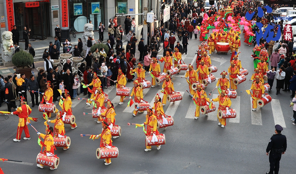 太平鼓隊(duì)的指揮者豹頭環(huán)眼,胸前“帥”字披紅,手中兩米長(zhǎng)的令旗迎風(fēng)一展——百十面太平鼓瞬間炸響如雷。只見他騰挪跳躍,旗尖所指,鼓點(diǎn)隨之起伏,時(shí)而如萬馬奔騰,時(shí)而似春雨潤(rùn)物。